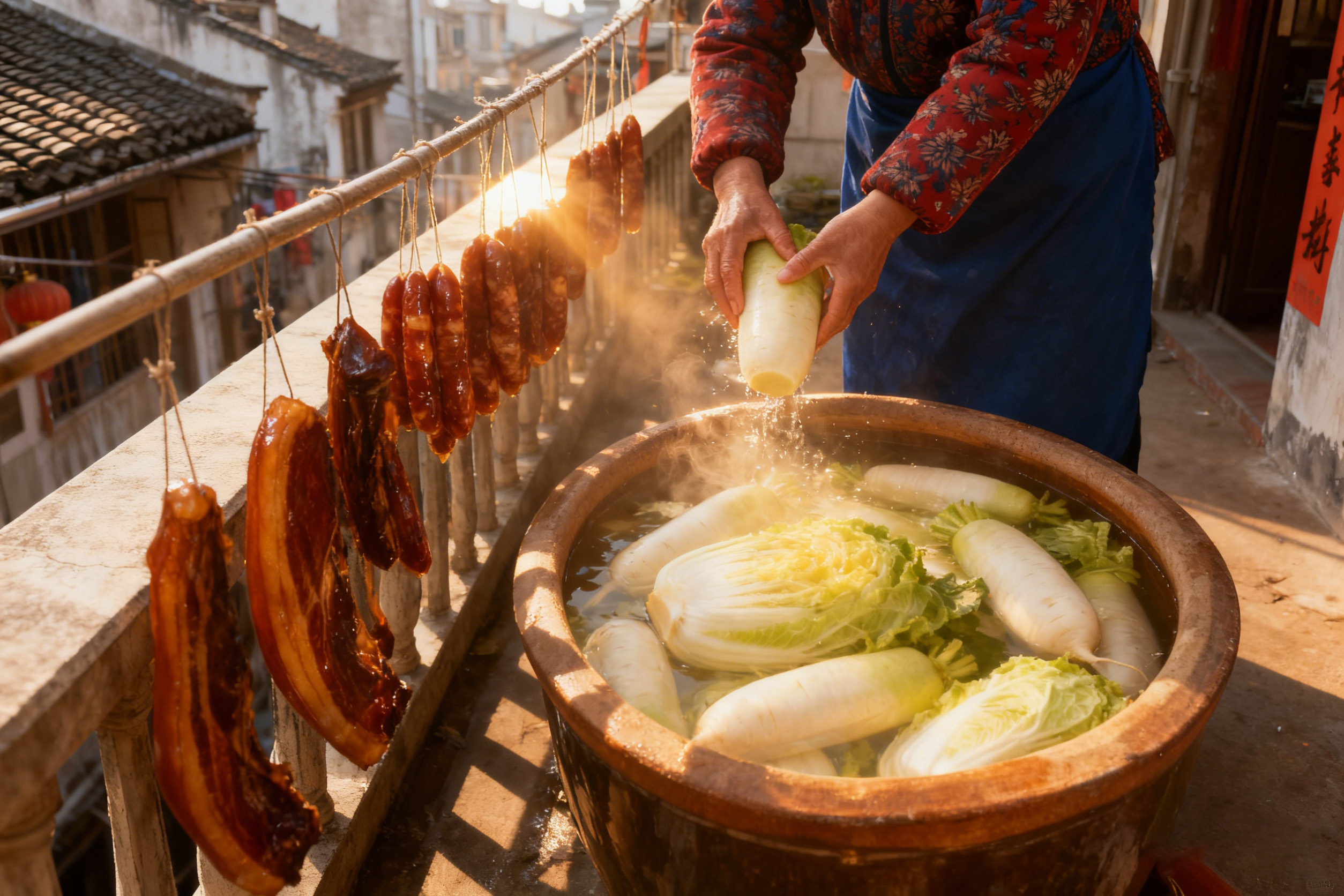 “冬腊风腌,蓄以御冬”,小雪一到,家家户户就开始忙着准备冬储食品。北方人会把白菜、萝卜腌进缸里,经过时间的发酵,变成爽口的酸菜、泡菜,成为冬日餐桌上最解腻的配菜。南方人则偏爱腌肉、灌香肠,阳台上、屋檐下,一串串油光锃亮的腊肉、香肠挂在那里,阳光洒过,香气便漫满整个巷子,那是年味的前奏,也是生活的烟火气。